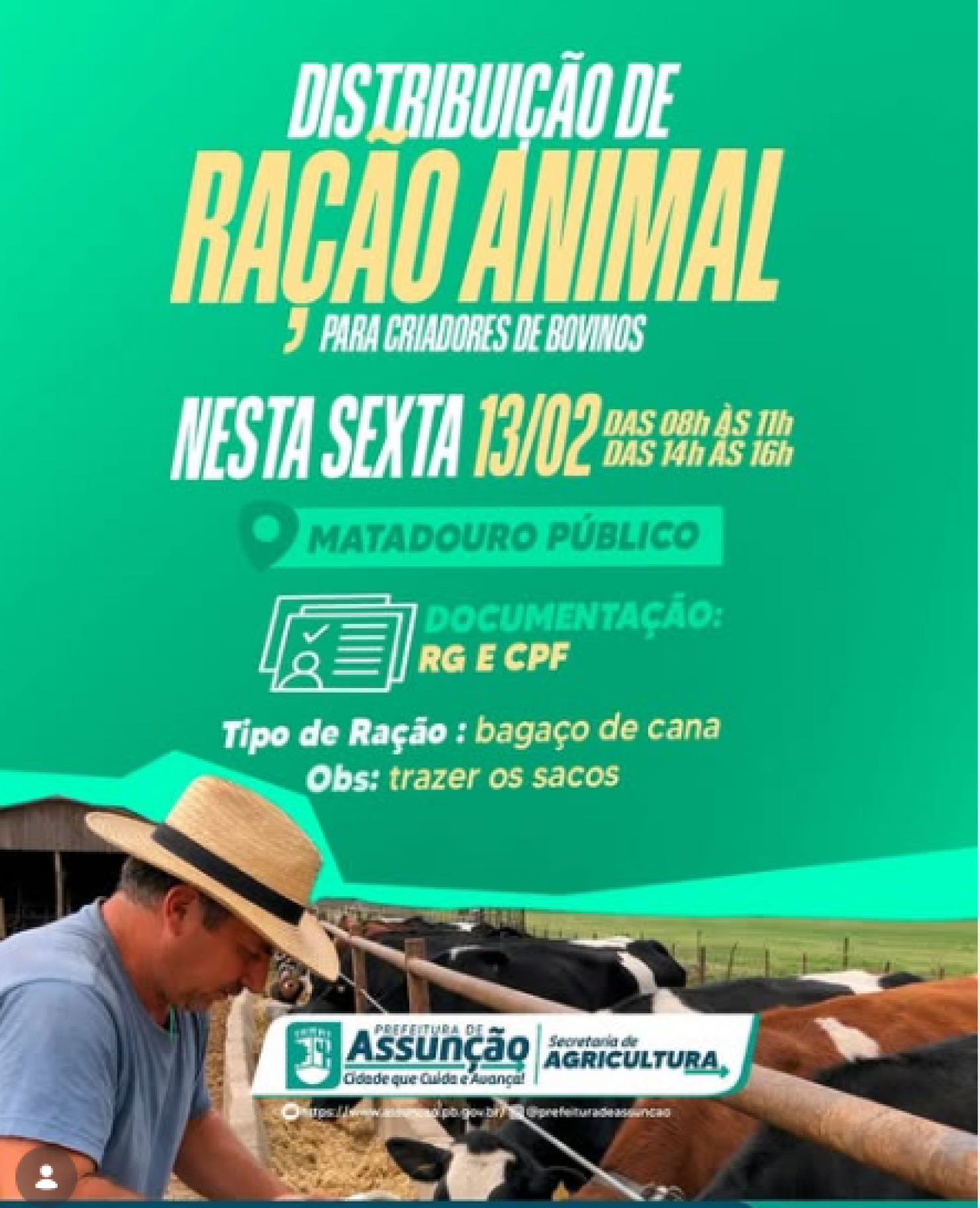 A Prefeitura de Assunção, por meio da Secretaria de Agricultura, realiza nesta sexta-feira (13/02) a distribuição de ração animal (bagaço de cana).