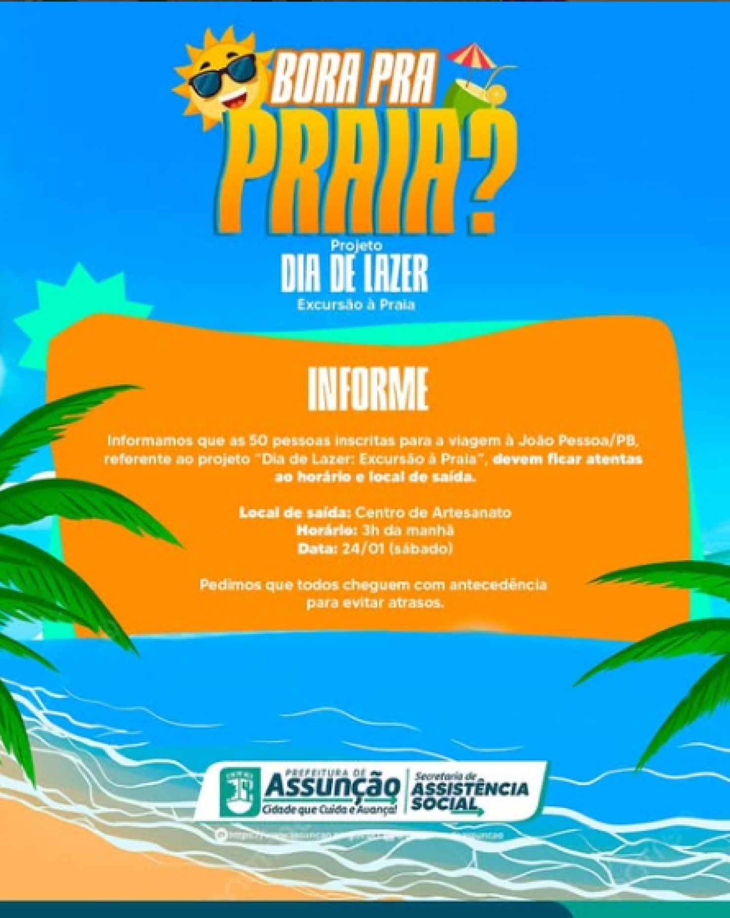 A Prefeitura de Assunção, por meio da Secretaria de Assistência Social, informa às 50 pessoas inscritas no projeto “Dia de Lazer – Excursão à Praia” que fiquem atentas ao horário e local de saída: