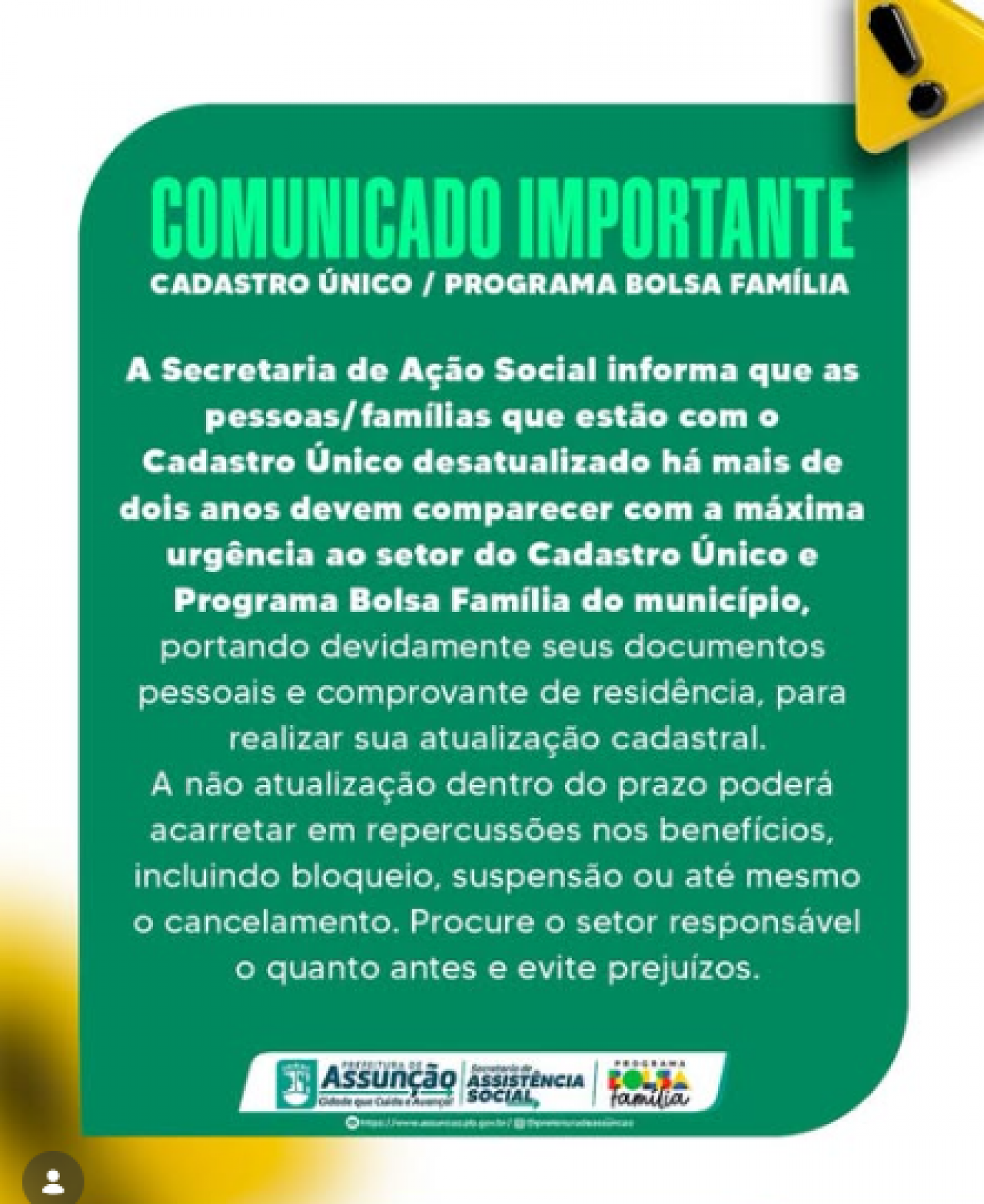 A Secretaria de Ação Social informa que as famílias que estão com o Cadastro Único desatualizado há mais de dois anos devem comparecer com urgência ao setor responsável para realizar a atualização cadastral.