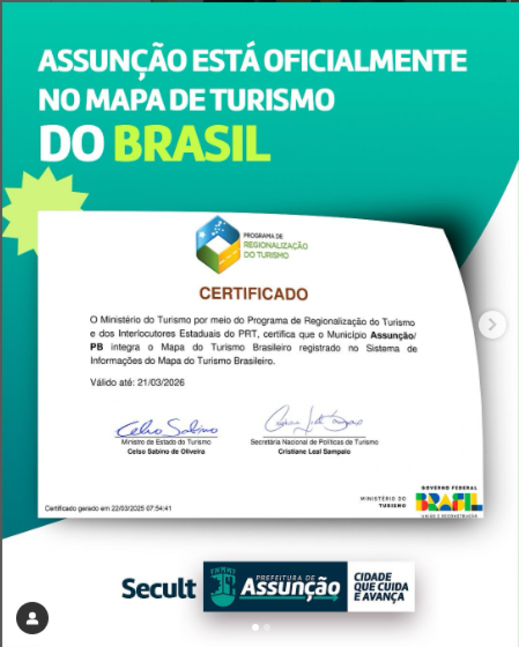 A prefeitura de Assunção, compartilha com alegria, através da @secult_assuncao que nossa cidade está oficialmente no mapa turístico do Brasil!