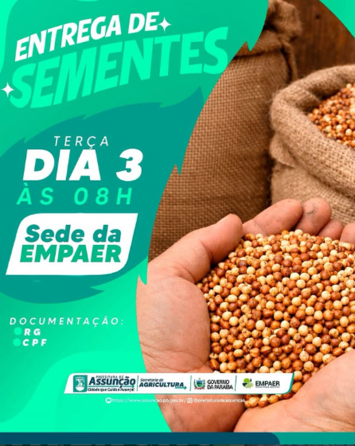 A Prefeitura de Assunção, por meio da Secretaria de Agricultura, em parceria com o Governo da Paraíba e a EMPAER, realiza nesta terça-feira (dia 3), a partir das 8h, a entrega de sementes para os agricultores do município.