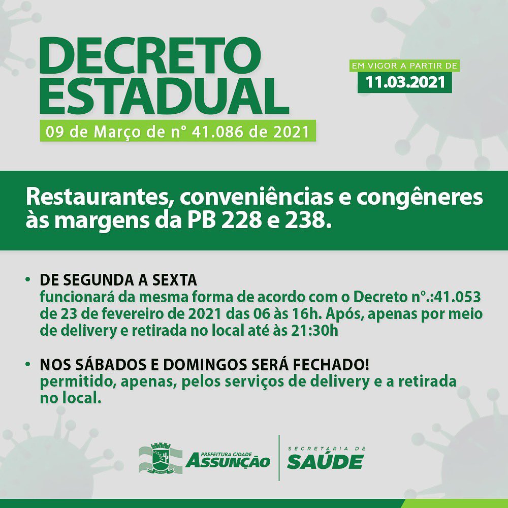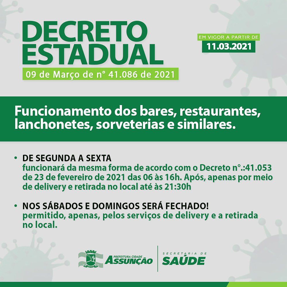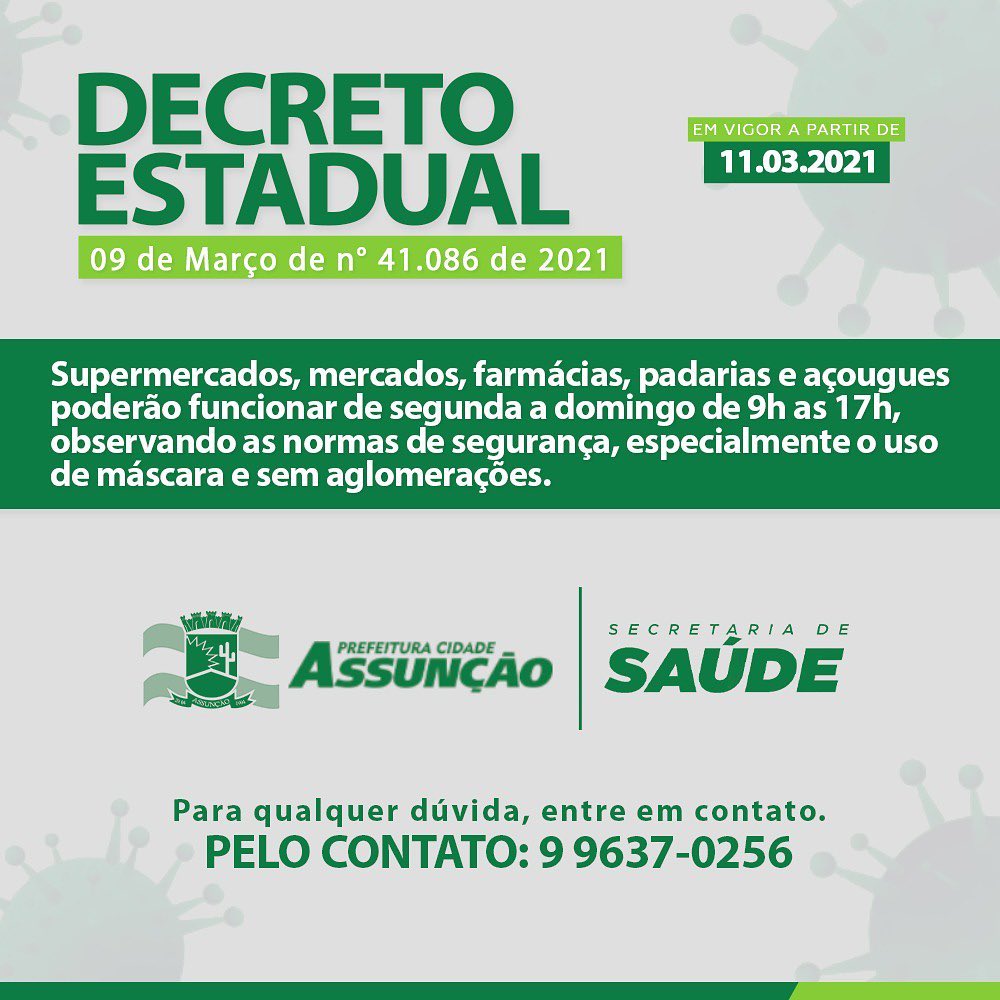 A Prefeitura de Assunção em atendimento ao DECRETO ESTADUAL de nº41.086/2021 adota medidas temporárias de prevenção ao contágio e de enfrentamento do novo coronavírus.