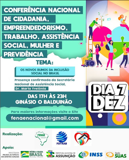 A CONFERÊNCIA NACIONAL DE CIDADANIA, EMPREENDEDORISMO, TRABALHO, ASSISTÊNCIA SOCIAL, MULHER E PREVIDÊNCIA vai acontecer quarta-feira dia 7 das 8 as 23 horas no ginásio o Balduinão.