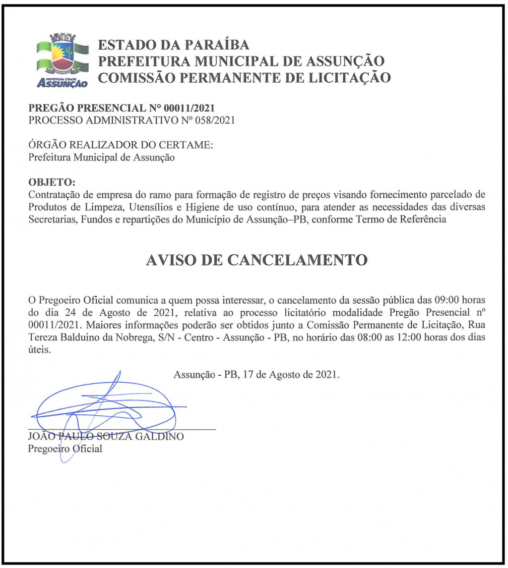 O Pregoeiro Oficial do Município comunica a quem possa interessar, o CANCELAMENTO da sessão pública das 9:00 horas do dia 24 de agosto de 2021, referente ao processo licitatório modalidade Pregão Presencial Nº 0011/2021.