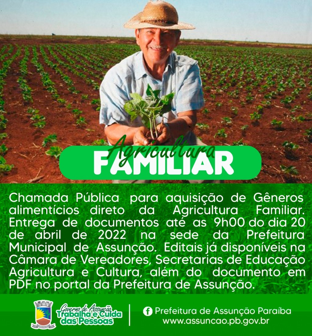 Torna público que fará realizar através da Comissão Permanente de Licitação, Chamada Pública de Compra objetivando: Aquisição de gêneros alimentícios da Agricultura Familiar e do Empreendedor Familiar Rural. Os interessados deverão apresentar envelope contendo a documentação e respectiva propositura até as 09:00 horas do dia 20 de Abril de 2022, na sala da referida comissão, sediada na Rua Tereza Balduíno da Nóbrega, S/N - Centro - Assunção - PB. Neste mesmo local, data e horário será realizada a sessão pública para abertura do respectivo envelope. Recursos: previstos no orçamento vigente. Fundamento legal: Lei Federal nº 8.666/93; e legislação pertinente, consideradas as alterações posteriores das referidas normas. Informações: no horário das 08:00 as 12:00 horas dos dias úteis, no endereço supracitado. Com esse processo a Prefeitura de Assunção formenta a distribuição de renda entre os seus cidadãos, com isso trazendo melhores condições para os agricultores e qualidade na alimentação dos nossos alunos.