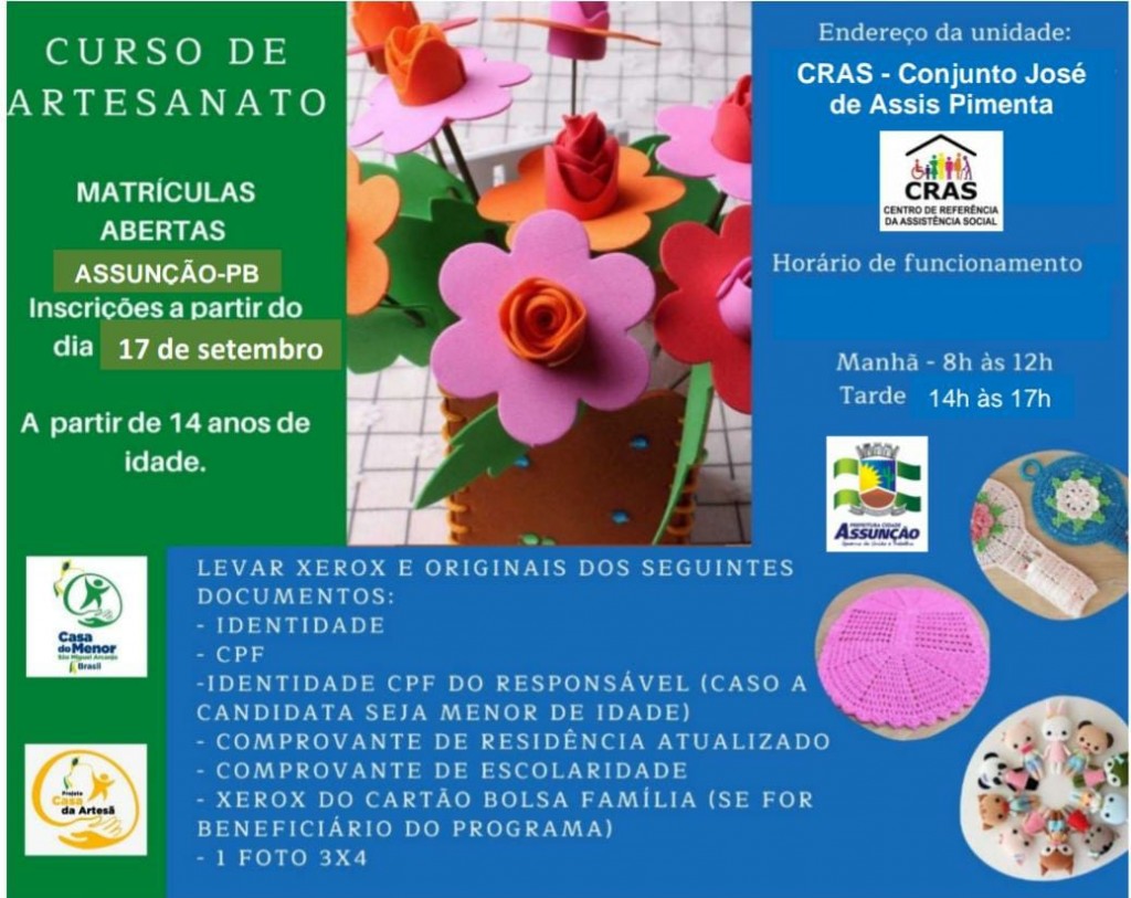 A Prefeitura Municipal de Assunção abriu nesta sexta-feira (17) as inscrições para o curso de Artesanato para maiores de 14 anos de idade.