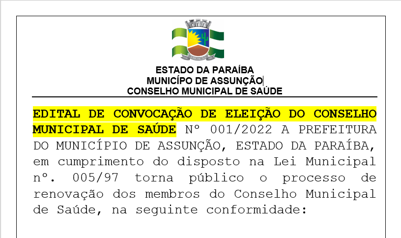 CONSELHO MUNICIPAL DE SAÚDE Nº 001/2022 A PREFEITURA DO MUNICÍPIO DE ASSUNÇÃO,