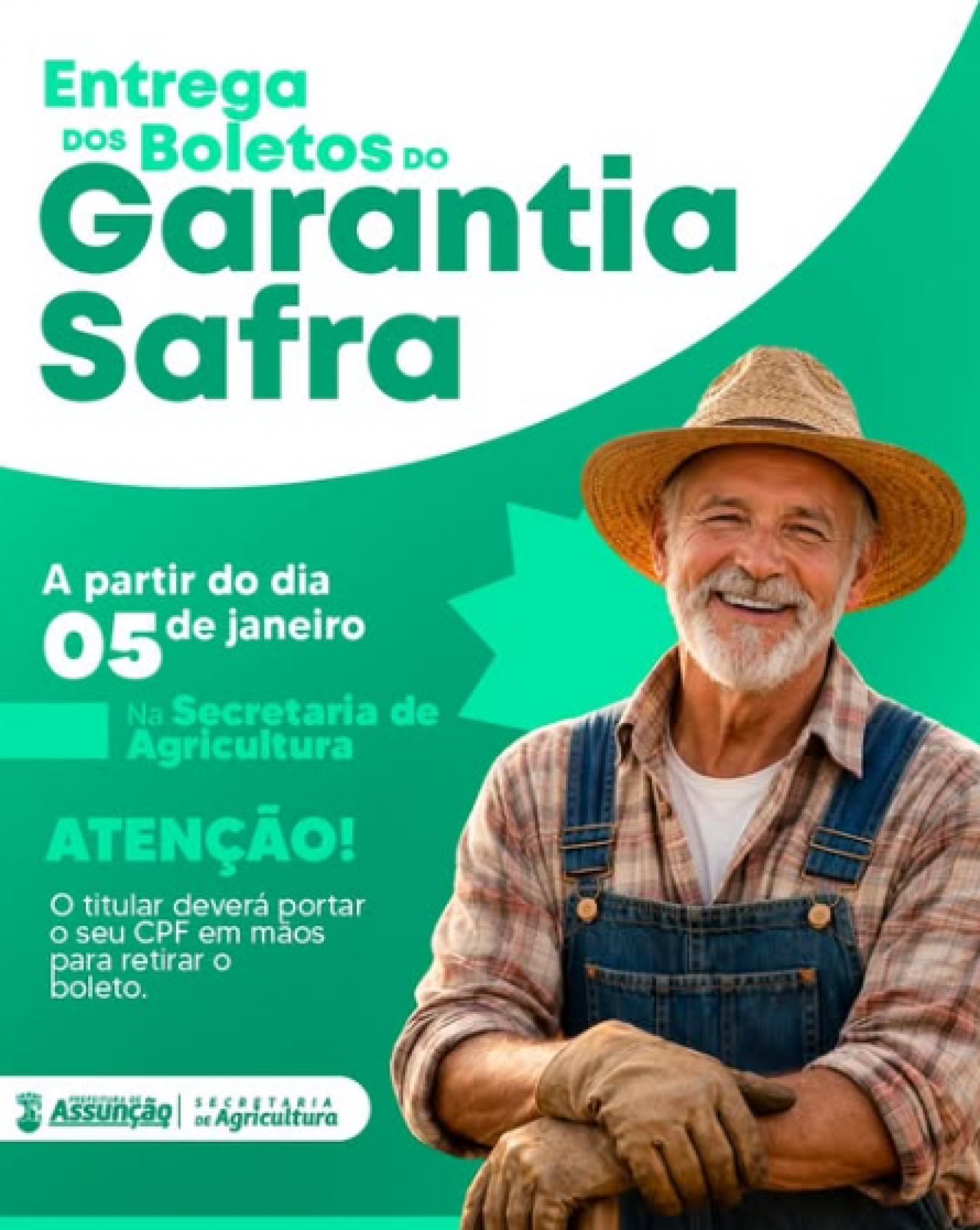 A Prefeitura de Assunção, através da Secretaria de Agricultura, informa que a entrega dos boletos do Garantia Safra terá início a partir do dia 05 de janeiro.