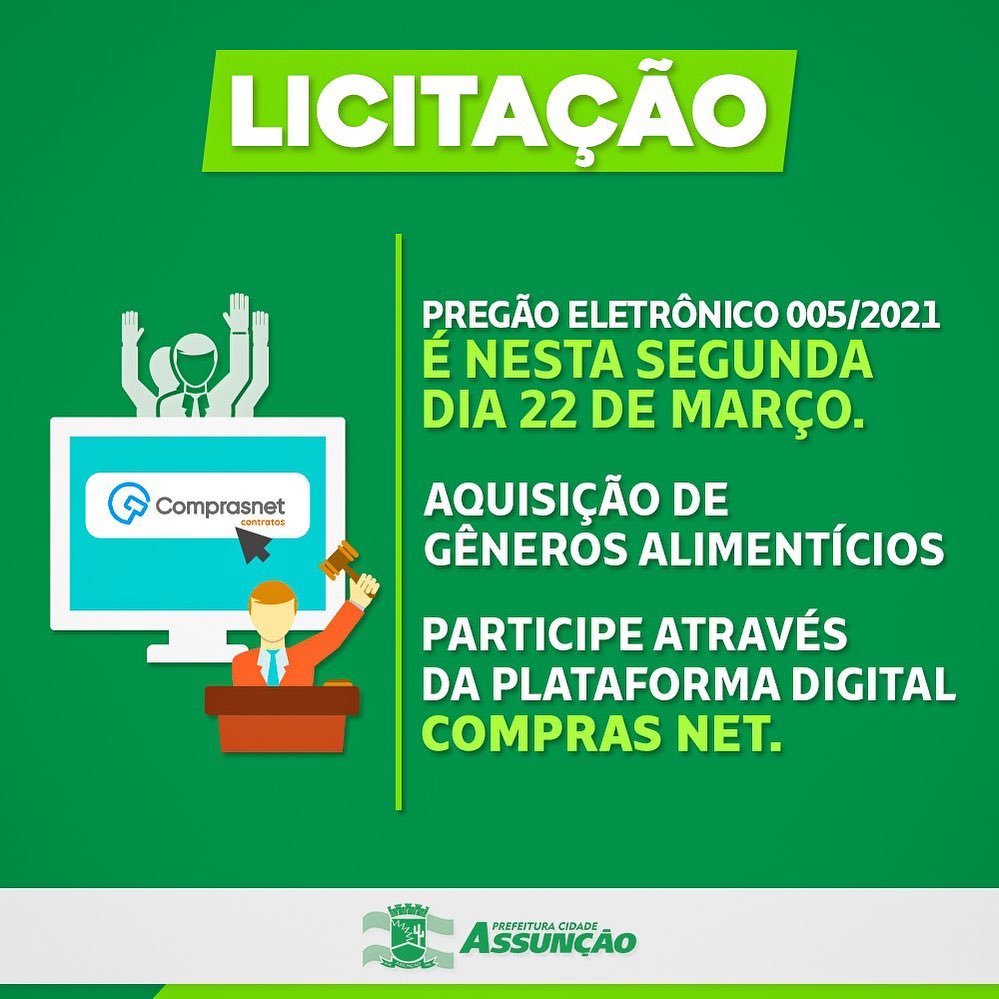 Na próxima segunda feira dia 22 de março será realizado o pregão Eletrônico Nº 005/2021 “Aquisição de Gêneros Alimentícios”.