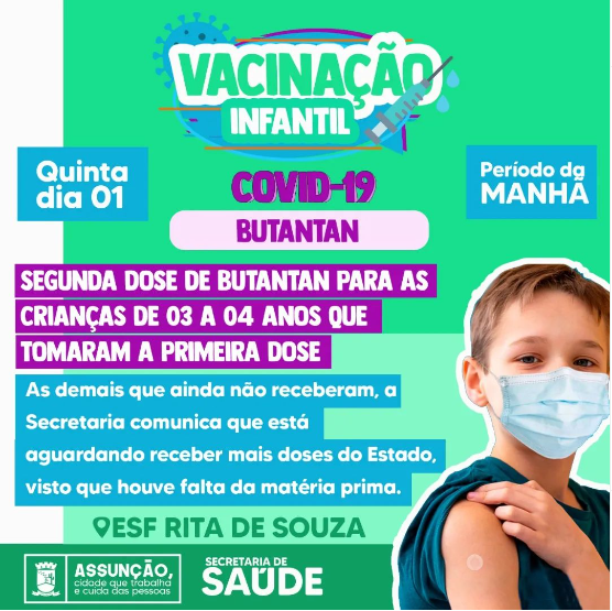 Na próxima quinta (01) teremos vacinação infantil contra a Covid-19 da tecnologia Butantan.