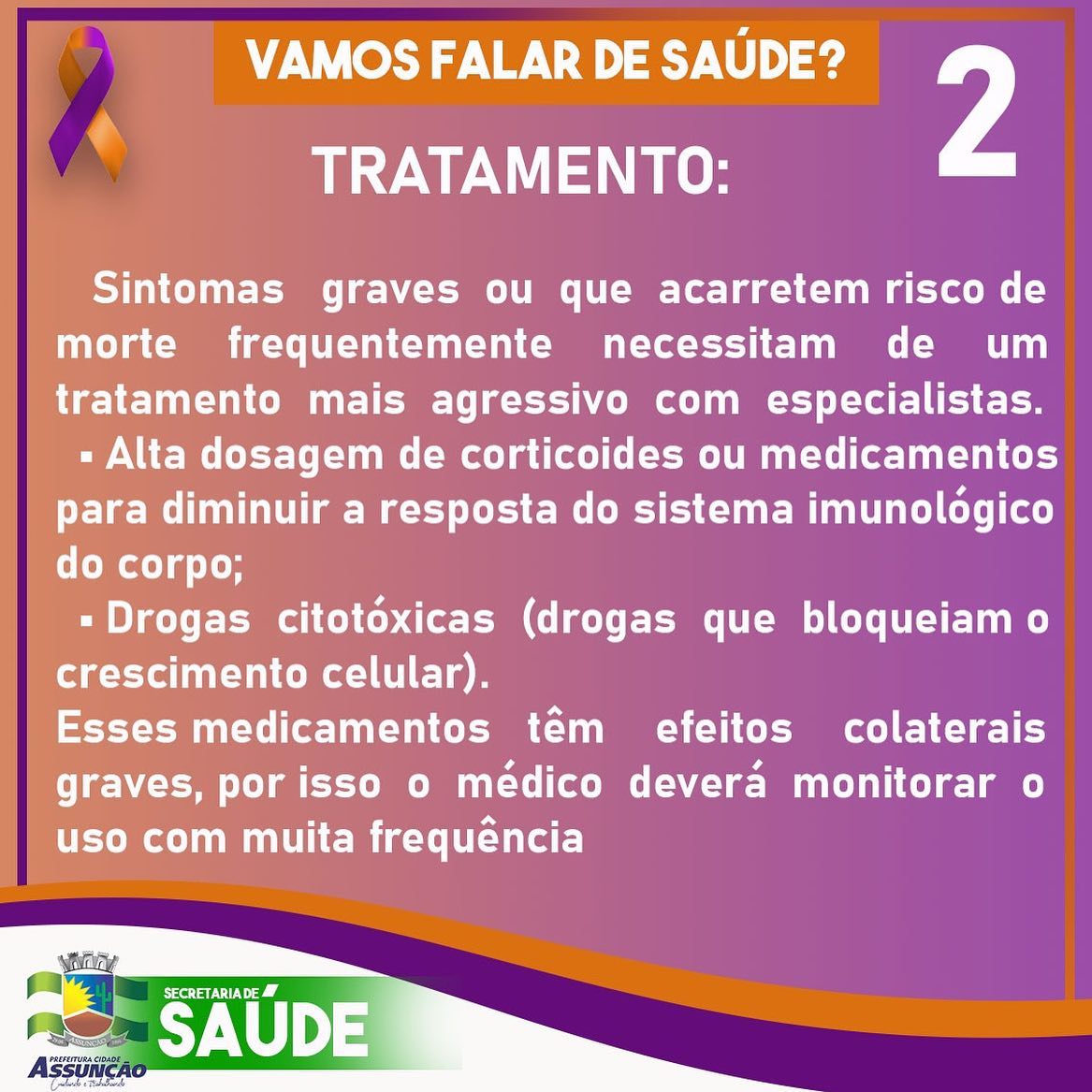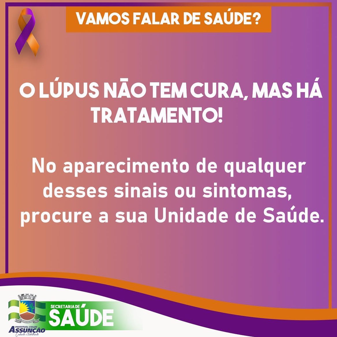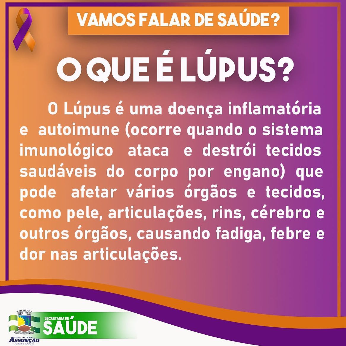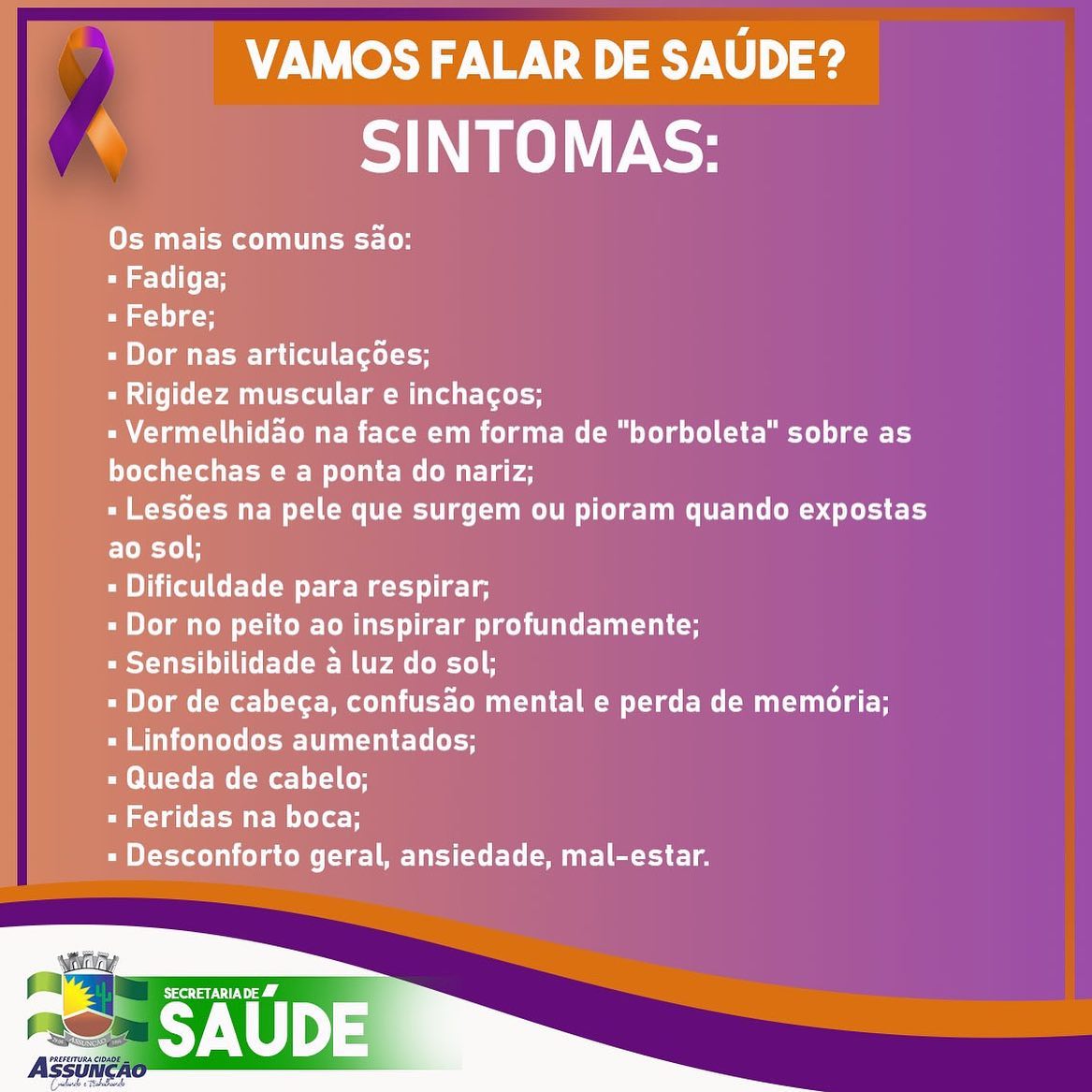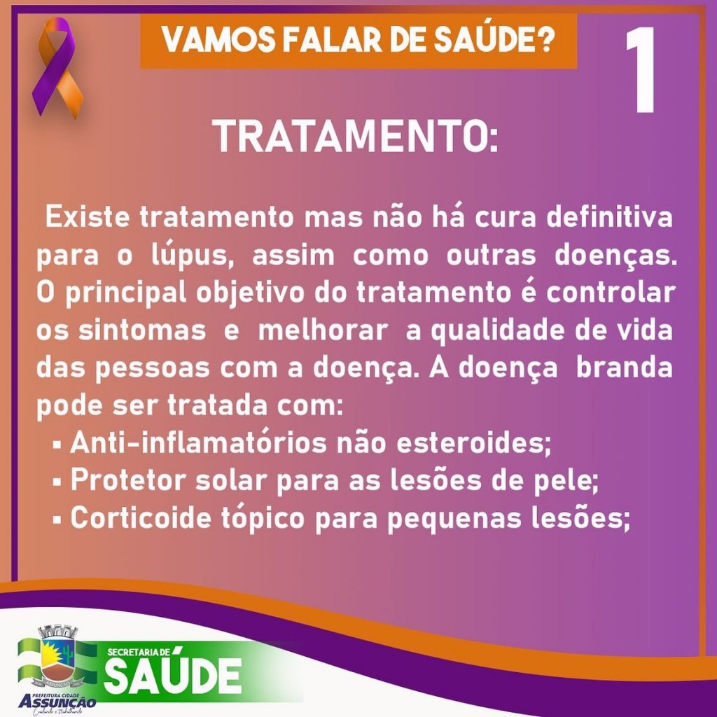 O mês de fevereiro é voltado a conscientização e ao combate a doenças como a Leucemia, Fibromialgia, Alzheimer e Lúpus. E a Secretaria de Saúde de Assunção está realizando durante todo o mês, divulgações e orientações do que é, as causas e os tratamentos de cada doença debatida na Campanha Fevereiro Roxo e Laranja.