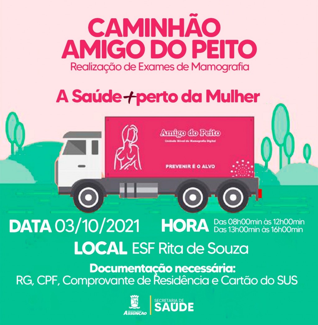 A Secretaria Municipal de Saúde anuncia a programação mensal da CAMPANHA OUTUBRO ROSA tendo inicio no dia 03/10/2021 na ESF Rita de Souza com o CAMINHÃO AMIGO DO PEITO realizando Exames de Mamografia durante todo o dia, fazendo necessário levar os documentos: rg, cpf, comprovante de Residência e cartão do sus. O principal objetivo dessa campanha é chamar a atenção da sociedade a respeito da realidade atual do câncer de mama no mundo.