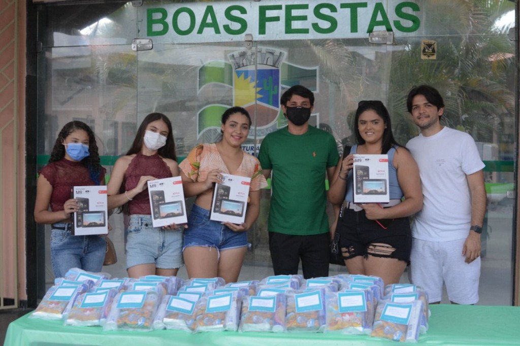 Kits contendo caneta, água, alimentos e máscara, foram distribuídos.