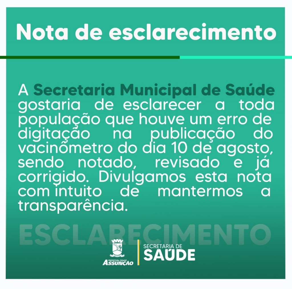 A Secretaria Municipal de Saúde gostaria de esclarecer a toda população que houve um erro de digitação na publicação do vacinômetro do dia 10 de agosto, sendo notado, revisado e já corrigido. Divulgamos esta nota com intuito de mantermos a transparência.