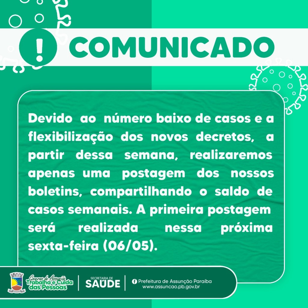 Devido ao número baixo de casos e flexibilização dos novos decretos, a partir dessa semana, realizaremos apenas uma postagem dos nossos boletins, compartilhando o saldo de casos semanais. A primeira postagem será realizado nessa próxima sexta-feira (06/05).