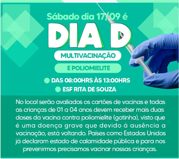 A Secretaria de Saúde estará promovendo neste sábado (17) o Dia D de Multivacinação e Poliomielite.