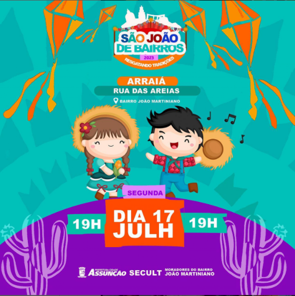 O Projeto São João de Bairros é uma realização da Prefeitura de Assunção através da Secult, e conta com o envolvimento total da comunidade do bairro João Martiniano. Será uma festa feita por todos e para todos, com o objetivo de preservar nossas raízes culturais e proporcionar momentos inesquecíveis de confraternização.