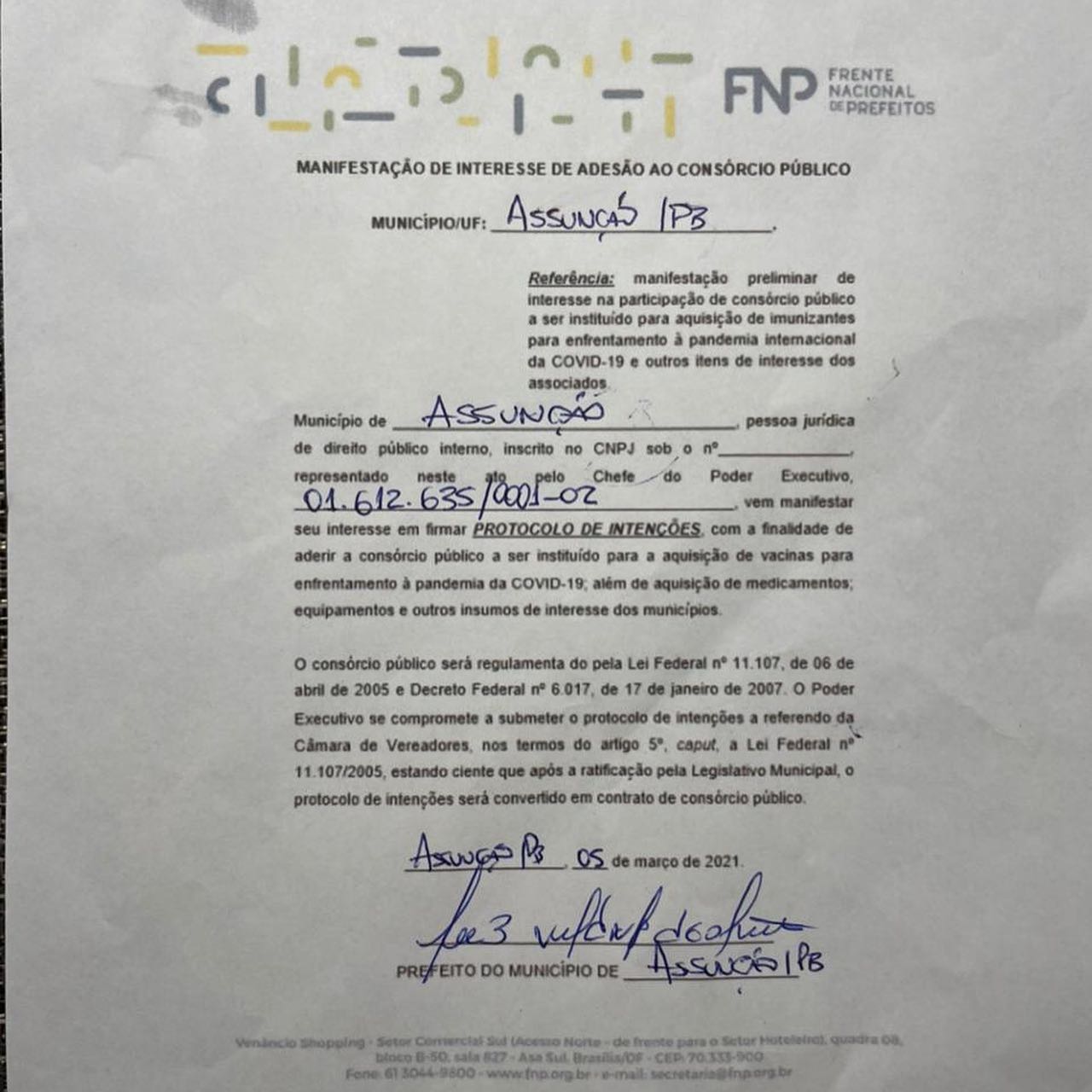 O município de Assunção realizou a adesão do consórcio que é gerenciado pela Comissão da Frente Nacional de Prefeitos (FNP) com a intenção de aquisição de doses de vacinas contra a Covid-19.